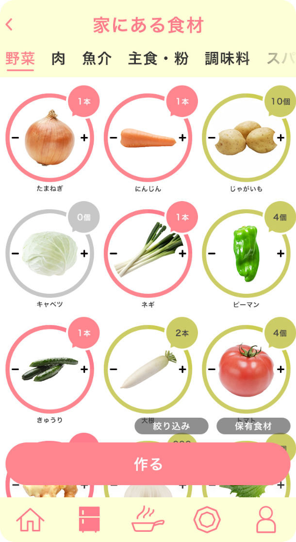 持っている食材と調味料を登録するだけで、今作れるレシピをワンタップで提案!