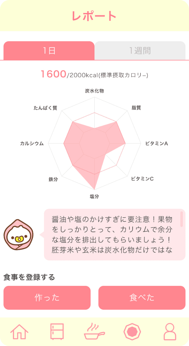 1日に作ったものや食べたものをpeccoに登録してくれると、1日の食事のバランスを管理栄養士がアドバイスしてくれるよ!